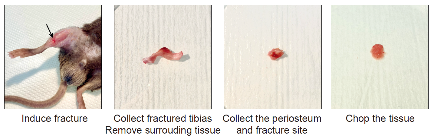 Incise the skin and remove it entirely from the fractured limb. Disconnect the tibia from the limb by cutting at the knee and ankle level and place it in a 100-mm sterile petri dish with RNAse-free chilled PBS.