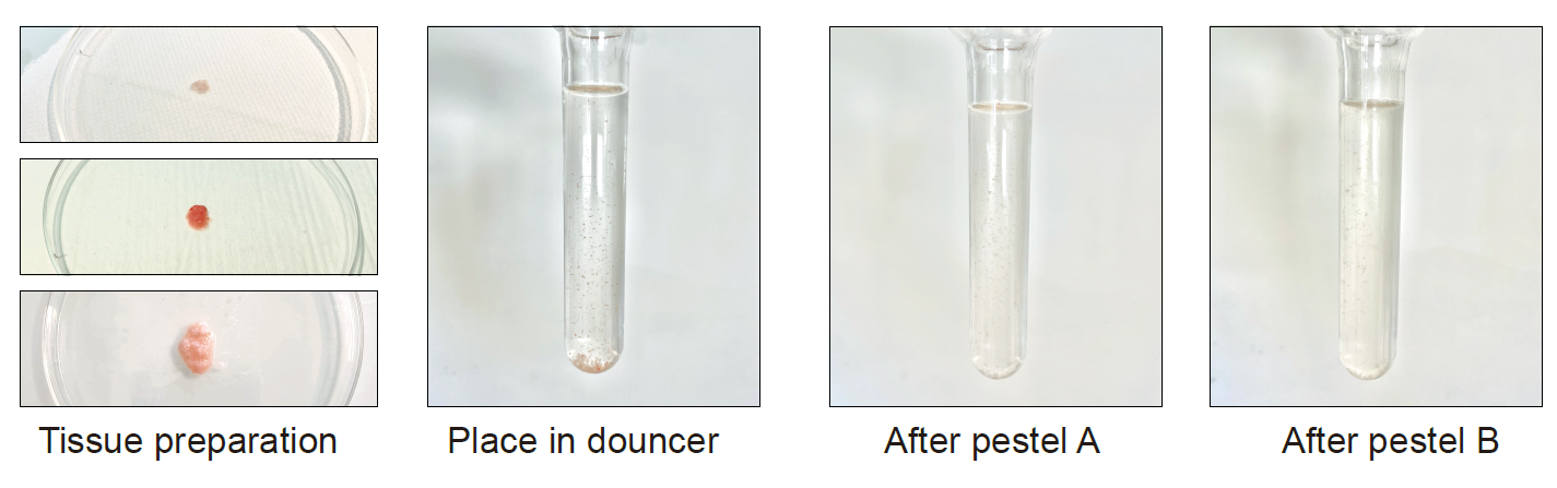 Note: There shouldn’t be too much resistance while using pestles. Resistance can be due to presence of big pieces of tissue, that would require a better chopping before putting the tissue in the douncer, or to a high ratio tissue / lysis buffer, that would require putting less tissue or more lysis buffer if possible.
