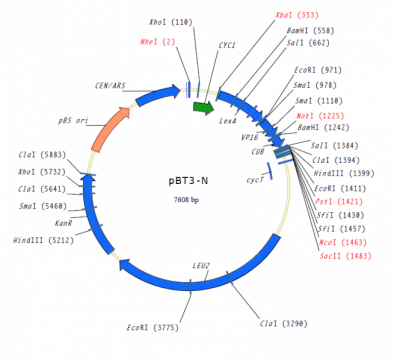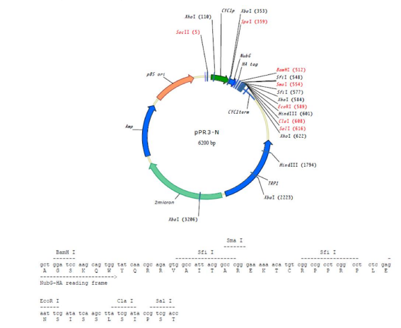 pBT3-N: Suitable for bait proteins whose N-termini are in the cytoplasm and C-termini are within the organelle lumen (or outside the cell). This vector ensures that the bait protein is correctly localized on the yeast cell membrane, and the ubiquitin NubG and Cub-LexA-VP16 connected to the interacting protein can interact and be recognized and cleaved by ubiquitin-specific proteases (UBPs), thereby initiating the expression of reporter genes.