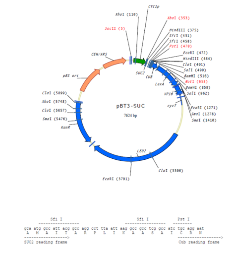 pBT3-SUC: Recommended for bait proteins whose C-termini are in the cytoplasm, N-termini are within the organelle lumen (or outside the cell), and the N-terminus contains a signal peptide. Some mammalian cell signal peptides may not be recognized in yeast, and pBT3-SUC contains a segment of the invertase (SUC2) gene sequence, which helps ensure that the bait protein is correctly localized on the yeast cell membrane.