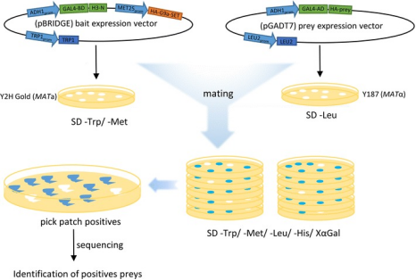 The above experiments have determined that the bait has no auto-activation, so Y2HGold[pGADT7+pBridge-B-X] can be omitted as a control, and plates containing 3-AT can also be omitted. SD/-Leu/-Trp plates are used only as a control when X promotes the interaction between A and B (since no colonies are present on SD/-Leu/-Trp/-His plates). If the growth of Y2HGold[pGADT7-A+pBridge-B-X] on SD/-Leu/-Trp/-His and SD/-Leu/-Trp/-His/-Met plates is the same, then X has no effect on the relationship between A and B.