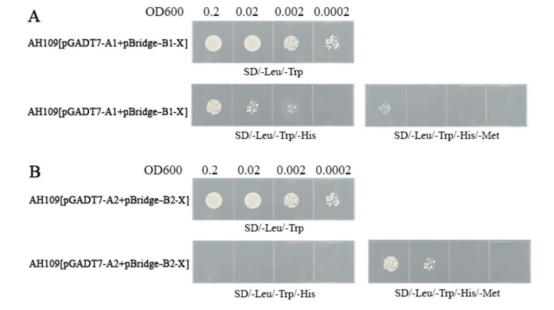 It is known from previous studies that A and B do not interact, and the bait has no auto-activation. Figure 1B, Y2HGold[pGADT7-A2+pBridge-B2-X] grows normally on SD/-Leu/-Trp plates (control), does not grow on SD/-Leu/-Trp/-His plates (i.e., A2 and B2 do not interact), but can grow on SD/-Leu/-Trp/-His/-Met plates, indicating that X promotes the interaction between A2 and B2.