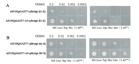 It is known from previous studies that A and B do not interact, and the bait has auto-activation. Figure 2B, the concentration of 3-AT** on both plates is the same and can just inhibit the auto-activation of the bait yeast (OD600=0.0002). Y2HGold[pGADT7-A4+pBridge-B4-X] grows stronger on SD/-Leu/-Trp/-His/-Met plates than on SD/-Leu/-Trp/-His plates, and stronger than Y2HGold[pGADT7+pBridge-B4-X] (i.e., bait yeast), indicating that X promotes the interaction between A4 and B4.