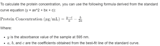 3.5 Measure the absorbance at 595 nm using a plate reader or a spectrophotometer.Plot a standard curve using the absorbance values of the standard protein solutions.Determine the protein concentration of the samples by comparing their absorbance values to the standard curve.