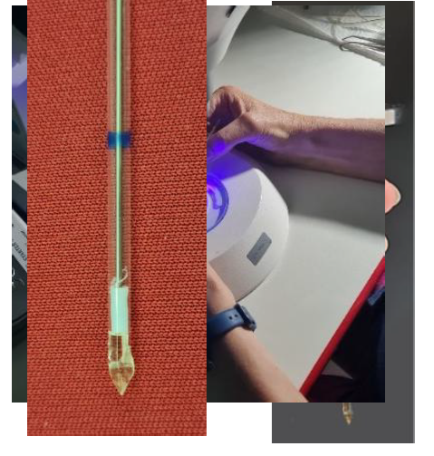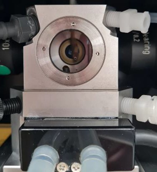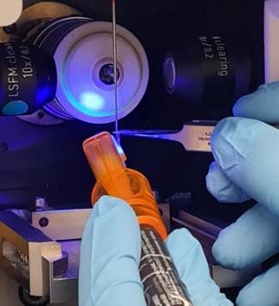 Regarding sample mounting of killifish at the age of 17 days post hatching, I gently attached a very small part of the caudal fin to a mounting support. For this purpose, I preferred to use a special UV light-curing resin with an applicator(Bondic UV Repair System), which allowed application of a minimal adhesive area. The resin was either applied onto a sample adapter available from Zeiss (see Quick Guide: Sample HolderUniversal for Capillaries and the image below) or onto a customized mounting support that was modeled at the end of a standard capillary (see image below). For the experiments presented in the publication, I used the latter approach.