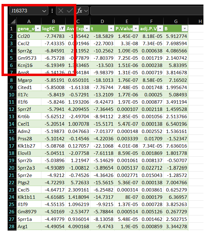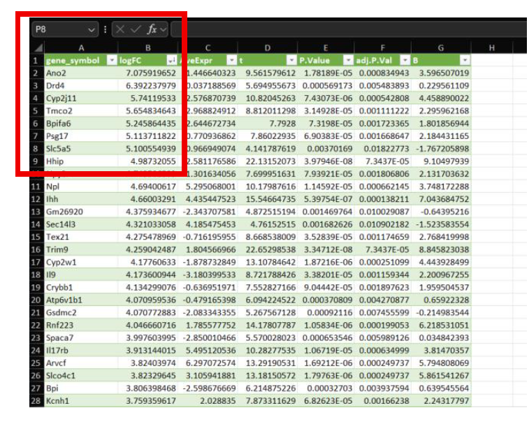 Genes represented in Column A now represent up- or downregulated genes with respect to Log2FC, however, you can also utilize P-Value, as seen above in representative Excel Sheets.