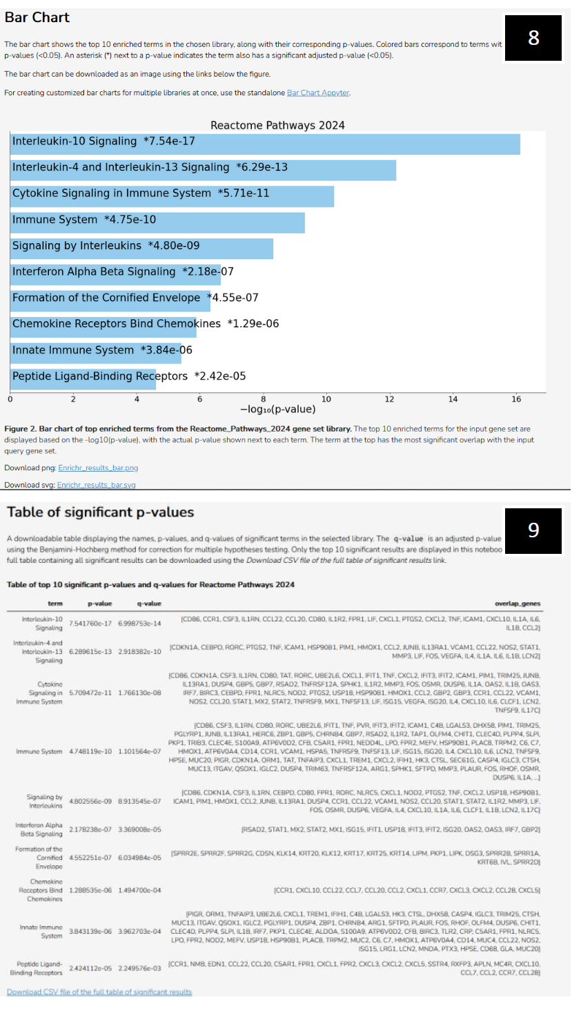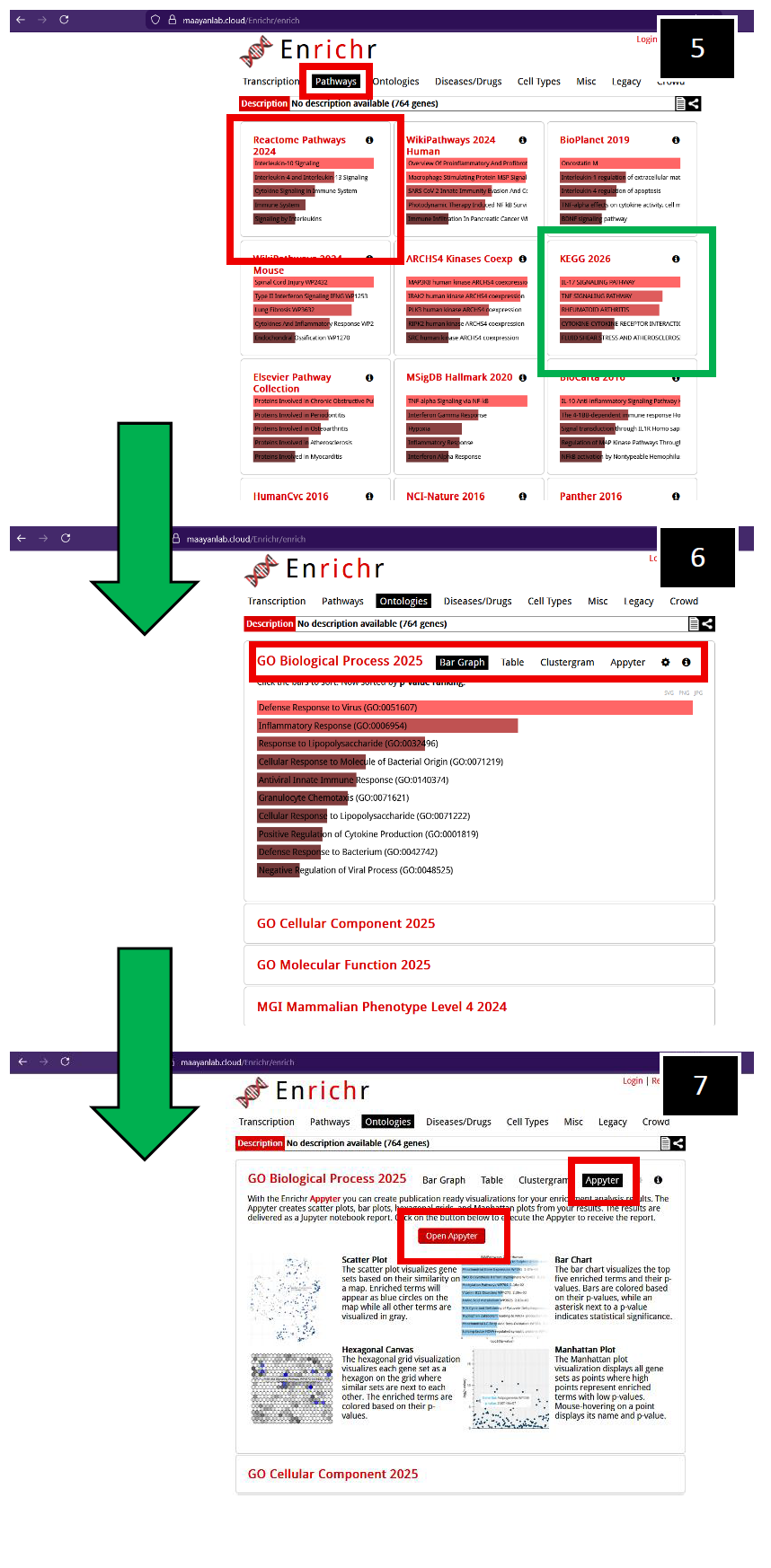 5. After navigating to “Pathways”, you will observe a suite of options. In this example, click on Reactome Pathways (2024) (Red-box outline), but other pathway analysis tools are available for you to explore if necessary, such as KEGG 2026 (Green-box outline). 6. Toggling the GO Biological Process (2025) generates more visualization options, initially displaying a bar graph of significant pathways as determined by GO. 7. To obtain bar graphs containing Log10 p-values with respect to significant pathways, toggle "Appyterz", then toggle "Open Appyter".