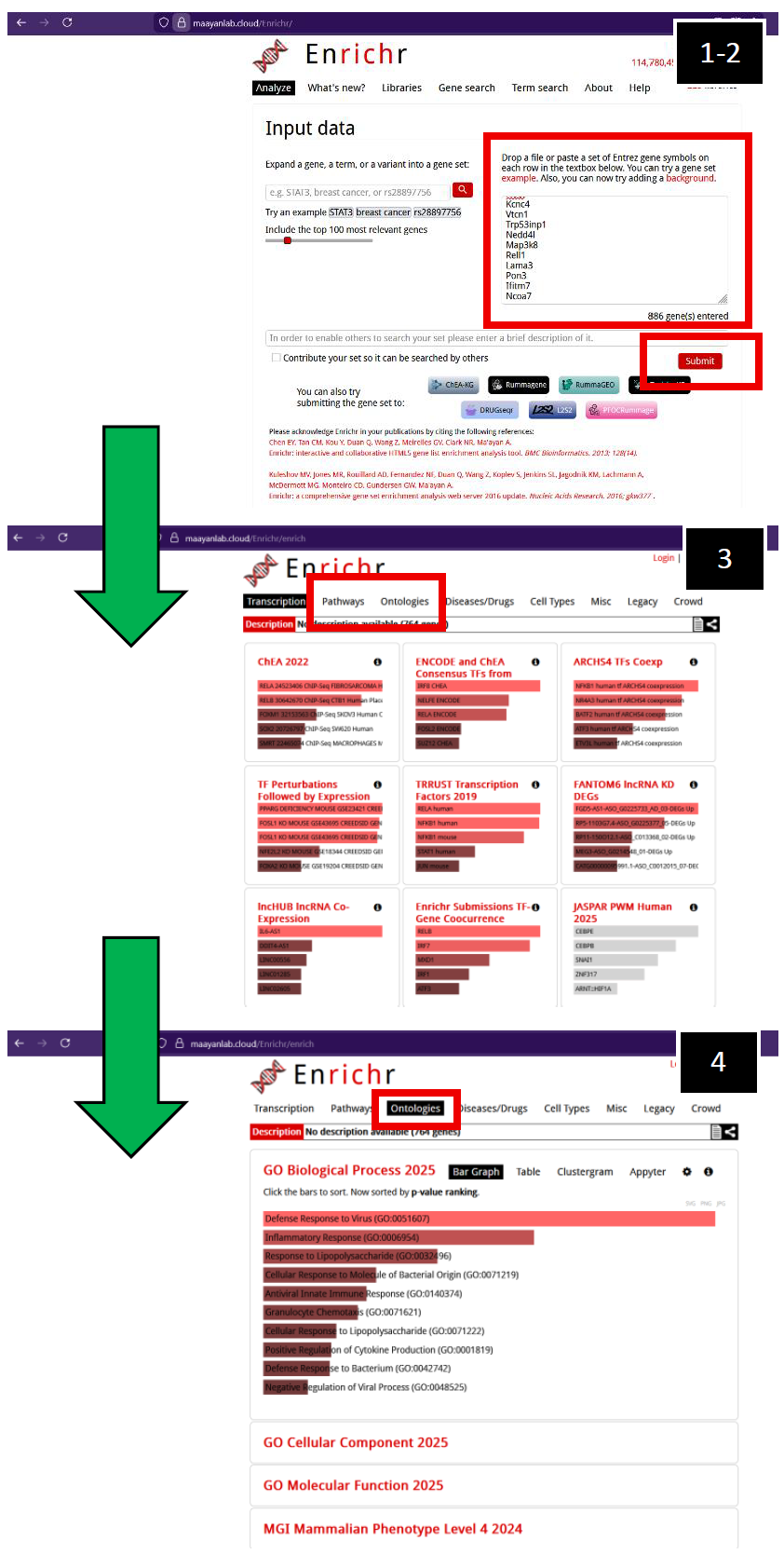 1. Enter filtered gene list of interest. You can upload a file or simply copy- and-paste your generated gene lists. 2. Press “Submit”. 3. The initial page you will navigate to is with respect to “Transcription”. Navigate to either “Pathways” or “Ontologies”. 4. After navigating to “Ontologies”, you will observe a suite of options. In this example, I clicked on GO Biological Processes (2025), but other pathway ontology analysis tools are available for you to explore if necessary. |