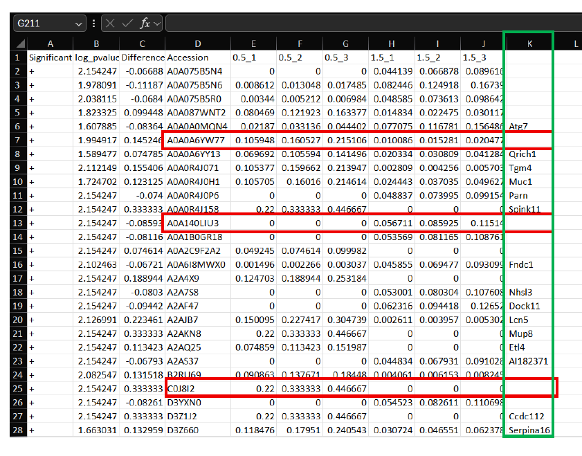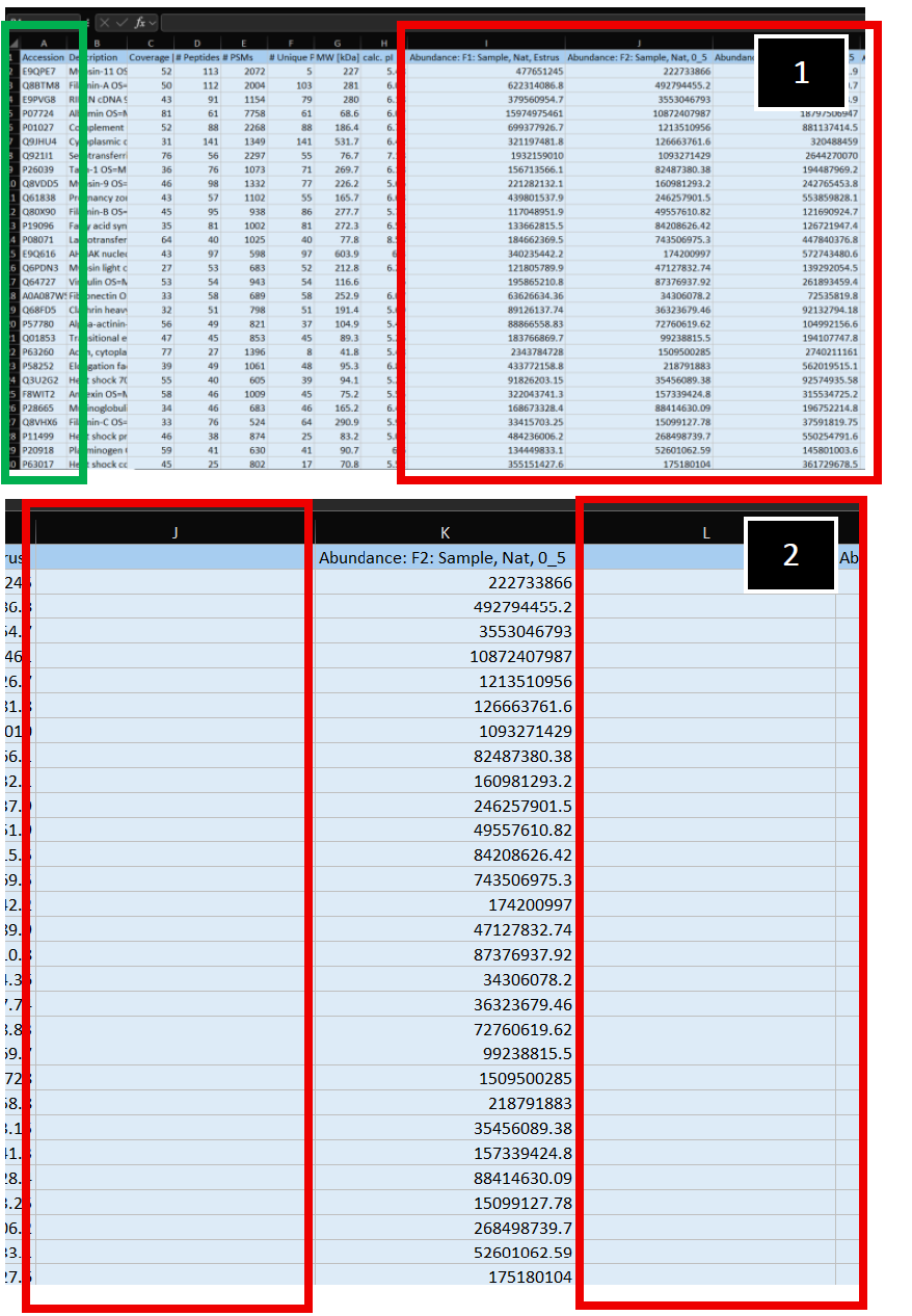 Tymora provided an Excel sheet, which contained an Accession ID (See image below, Red-box outline) for every protein identified in our luminal protein samples. Additionally, the abundance value associated with the Accession ID protein was provided.