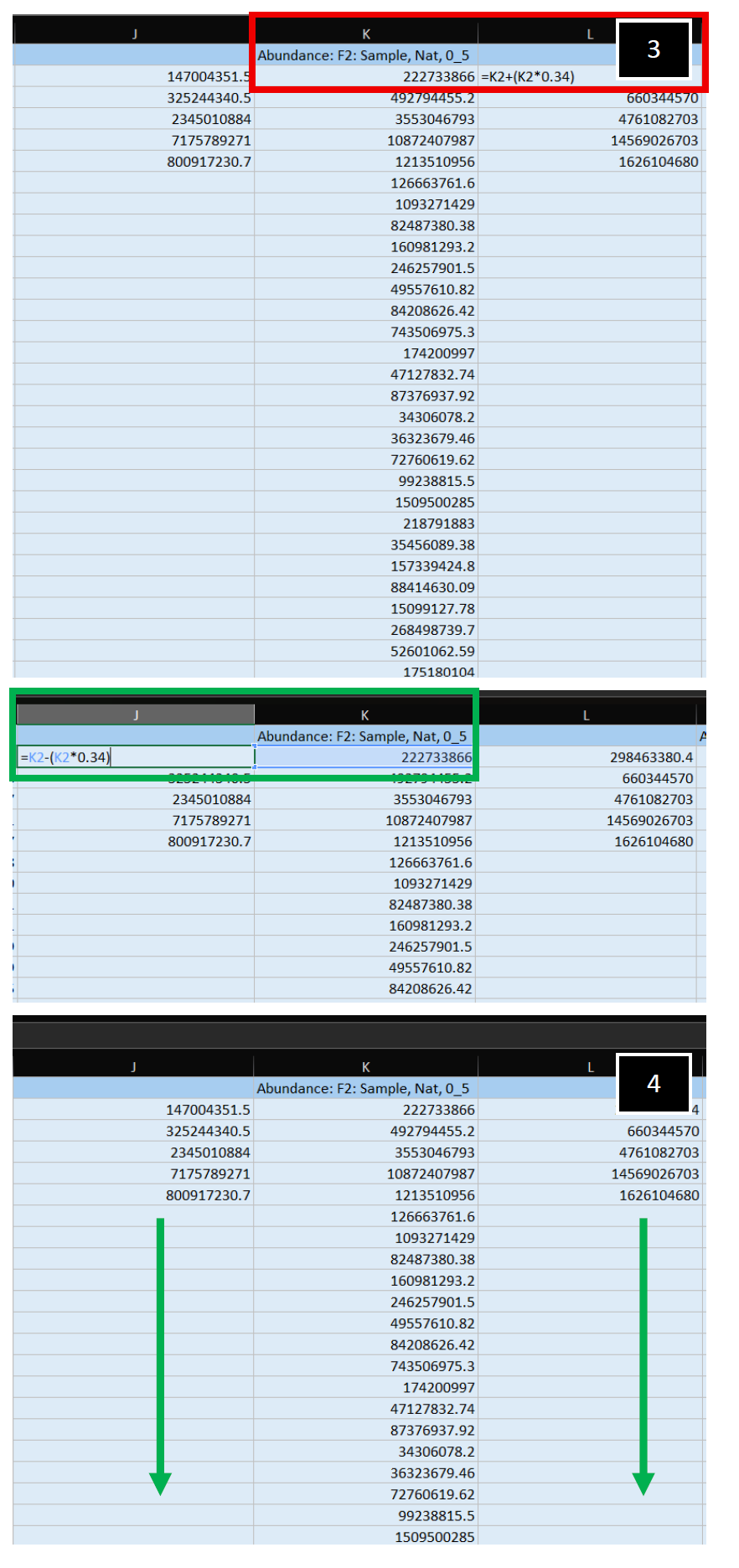 ![]() | 3. Apply a Gaussian Normal Distribution transformation to your empirically measured abundance value. In this example, one-standard deviation to the right (+, Column L, Red-box outline) and to the left (-, Column J, Green-box outline) were applied to the center, empirically measured value.
