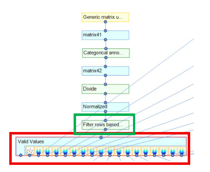 Next, utilize the Perseus function "filter rows based on valid values" (Green-box outline in image below). Here, you define the minimal number of valid values each row needs to have in the expression columns to survive the filtering process. More detailed Perseus instructions here https://cox-labs.github.io/coxdocs/filtervalidvaluesrows.html.