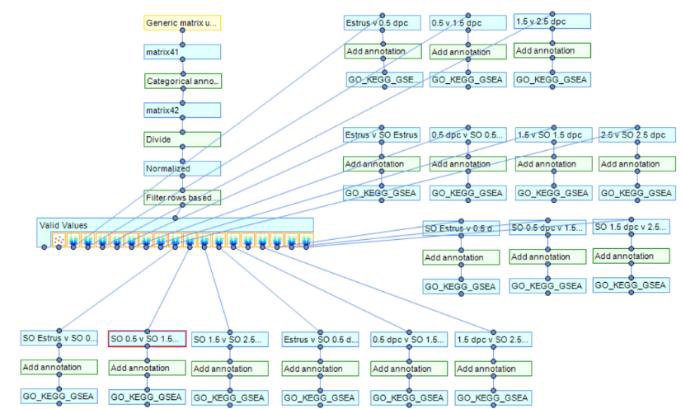 To generate a matrix of differentially expressed proteins between timepoints or conditions, a volcano plot was utilized. After which a matrix was generated and exported with corresponding Accession ID' s. In the comparison below, I compared 0.5 dpc to 1.5 dpc.