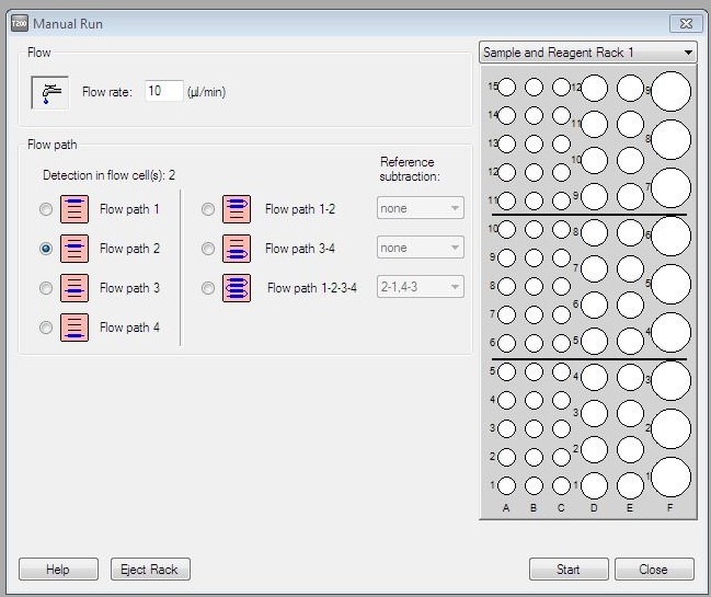 (2)点击Run下面的Manual Run,Flow rate输入10 μL/min,选择Flow path 1–2(Flow path的选择可以根据芯片的实际使用情况来选择),右侧下拉菜单中选用Sample and Reagent Rack 1,点击Start,输入文件名称保存。