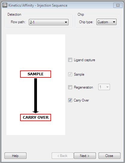 (4)在Injection Sequence界面,Flow path选择2–1,Chip type选择Custom(因这里选择NTA芯片,会在每一个浓度梯度之前重复进行镍离子螯合和TrpRS固定的步骤,而在前面的步骤中为了克服单独镍离子螯合TrpRS基线不稳定的问题,我们使用镍离子螯合联合氨基偶联的方式完成了TrpRS的固定,所以这里直接选择Custom芯片进行吲哚霉素浓度梯度的上样即可),勾选Sample和Carry Over,点击Next(图5)。