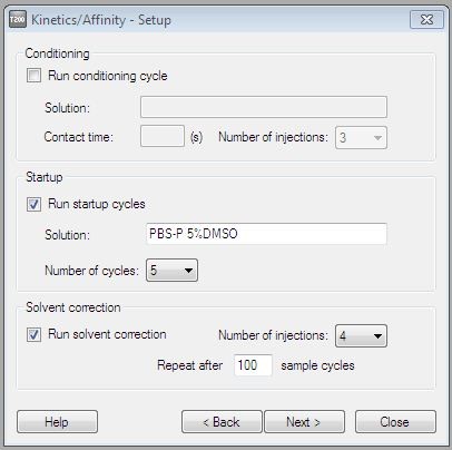 (5)在Setup界面,勾选Run startup cycles,Solution输入PBS-P, 5% DMSO,Number of cycles选择5;勾选Run solvent correction, Number of injections选择4,Repeat after 100 sample cycles, 点击Next(图6)。