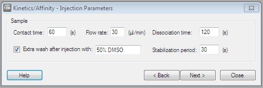 (6)在Injection Parameters界面,Contact time输入60 s,Flow rate输入30 μL/min,Dissociation time输入120 s,Extra wash after injection with输入50% DMSO,Stabilization period输入30 s,点击Next(图7)。