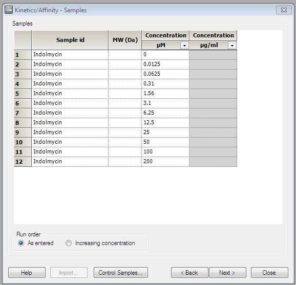 (7)在Samples界面,输入吲哚霉素的Sample id以及浓度梯度(通常为浓度由低到高输入,8–12个浓度梯度即可),Run order选择As entered,点击Next(图8)。