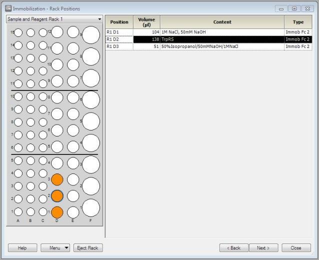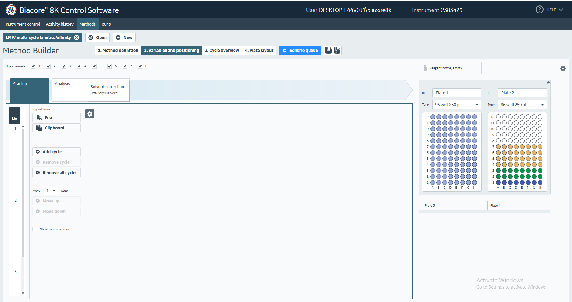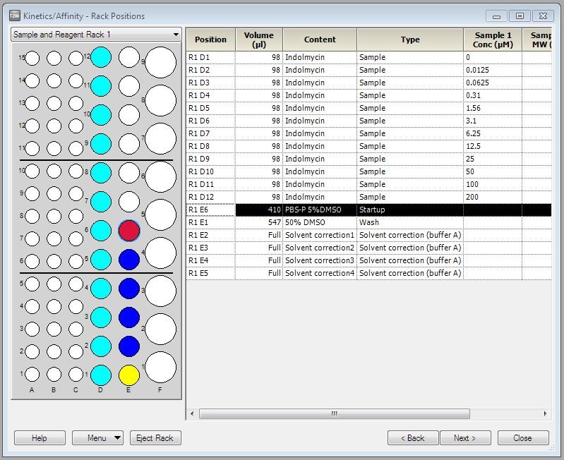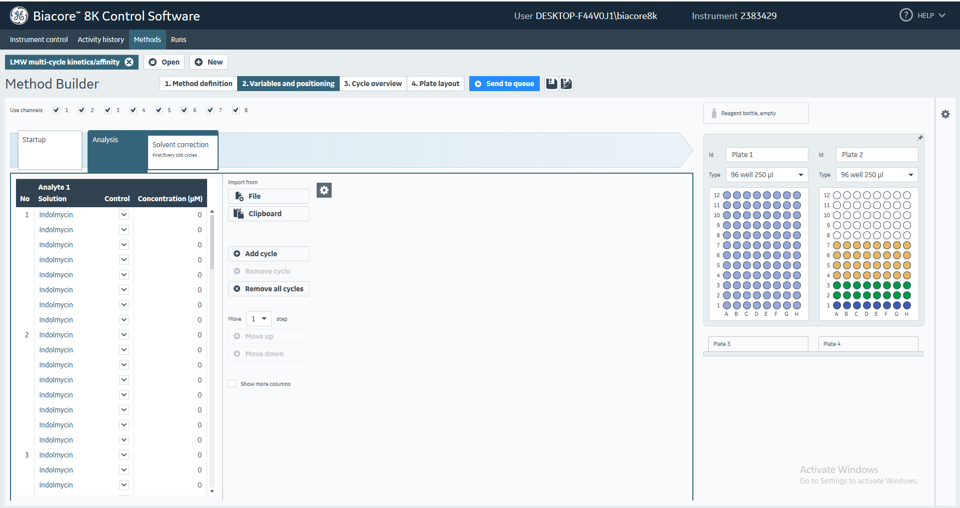 注意:若在Method definition界面中选择的蛋白固定通道少于8道,由于Biacore 8K中的8根进样针只能同上同下,因此需要在相应未固定蛋白的通道对应的96孔板中的位置中加入所需体积的缓冲溶液。