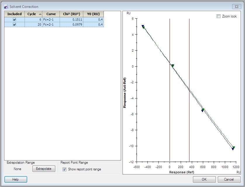 (2)首先点Solvent Correction进行溶剂校正分析(图11)。溶剂校正曲线一般要求落在-500到+1000 RU之间,Chi2小于2。如果超出此范围较多,一般是由于DMSO浓度配制不准确造成。