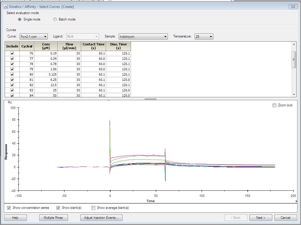 (3)点击Kinetics/Affinity下的Surface bound进行拟合(图12)。小分子因亲和力较弱,多数没有动力学曲线,因此常选用Affinity拟合。亲和力较强且有动力学曲线的小分子可选用Kinetics模型拟合。选择要分析的样品,在Included一栏中可以选择待分析的样品浓度。若样品某个浓度的检测结果不合适,可以将此浓度前的对号勾掉,以删除此浓度,点击Next,选择Affinity,进行亲和力拟合,继续点击Next。