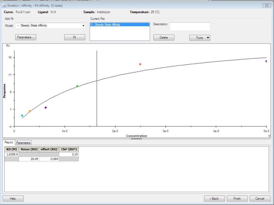 本次实验偶联量约为1,010 RU(图38)。经拟合,在此条件下,吲哚霉素与TrpRS的亲和力KD为16.7 ± 3.6 μM(图39)。
