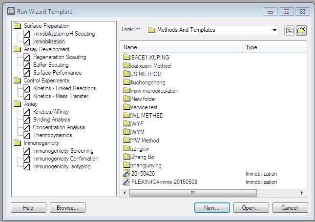 (1)点击Biacore T200 Control Software菜单栏中的Run,下拉菜单选择Wizard,点击immobilization,点击New(图14)。