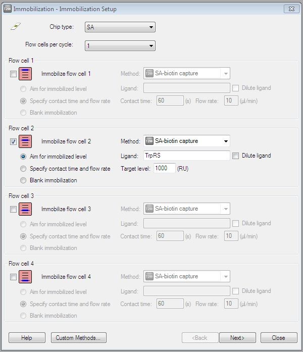 (2)在Immobilization Setup界面,Chip type中选SA,Flow cells per cycle选1。勾选Flow cell 2,method选用SA-biotin capture,Ligand输入TrpRS,该实验选用Aim for immobilized level,Target level输入1000 RU(图15)。接着按Next,勾选prime,选择实验温度,一般默认25 °C。