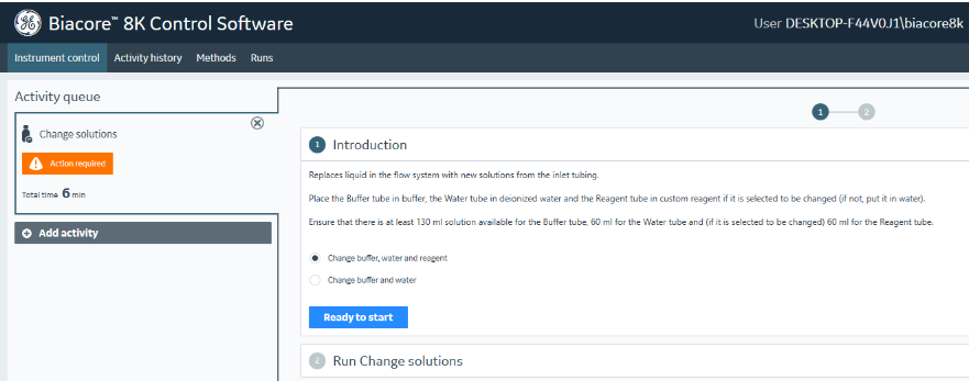 (7)选择instrument control,点击Change solutions,勾选Change buffer, water and reagent,点击Ready to start(图19)。缓冲溶液会以较高的流速冲洗整个内部流路系统,整个过程耗时6⁓7分钟。结束后,系统自动转入待机(Standby)状态。