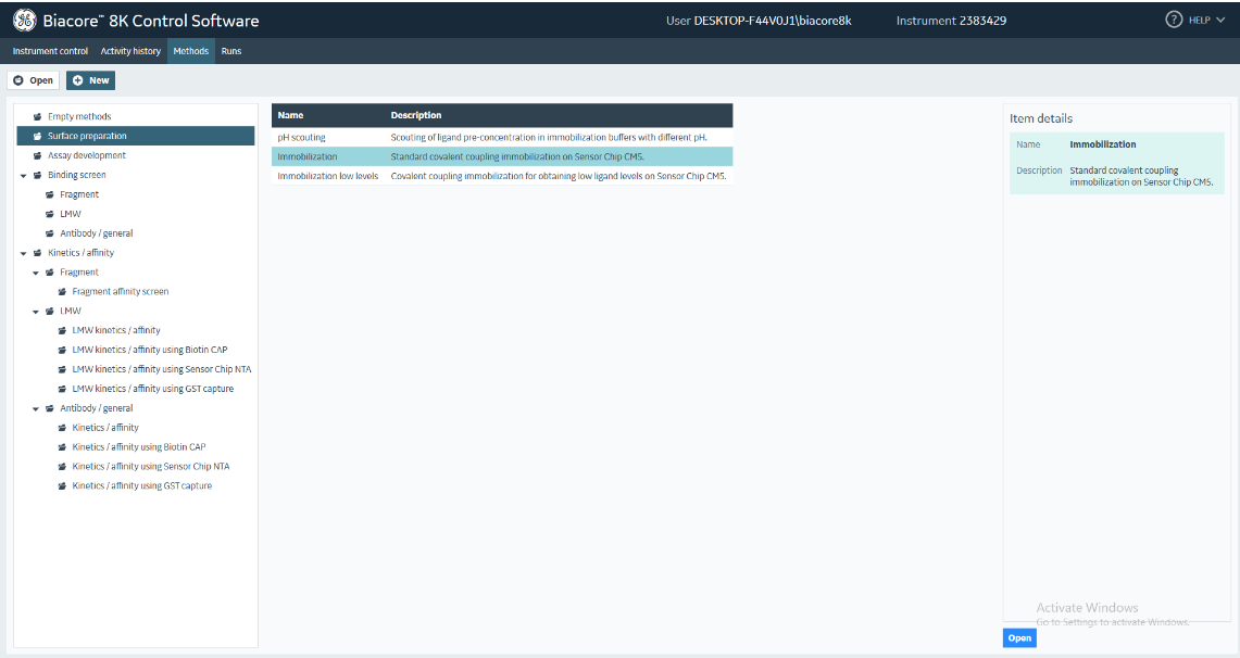 (1)打开Biacore 8K Control Software,选择Methods,点击Surface preparation,选择immobilization,点击Open(图20)。