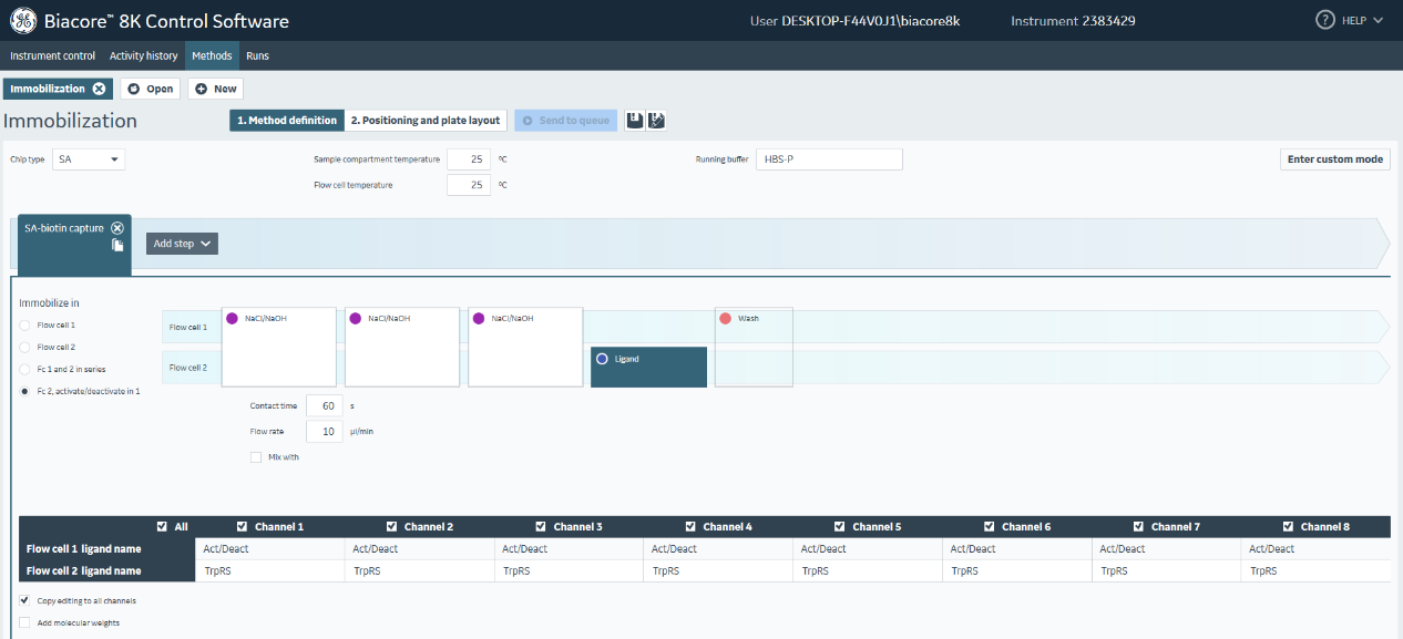 (2)在Method definition界面,Chip type选择SA,Running buffer输入HBS-P(根据实验体系的实际情况输入),温度一般默认25 °C(根据实验体系的实际情况输入),Add step选择SA-biotin capture,immobilize in选择Fc 2, activate/deactivate in 1, Ligand中contact time输入60 s,Flow rate 10 µL/min,在下方表格中输入固定蛋白的名字和选择需要进行固定的通道(图21)。在这里在表格中Flow cell 2 ligand name中输入TrpRS,选择同时固定8个通道。