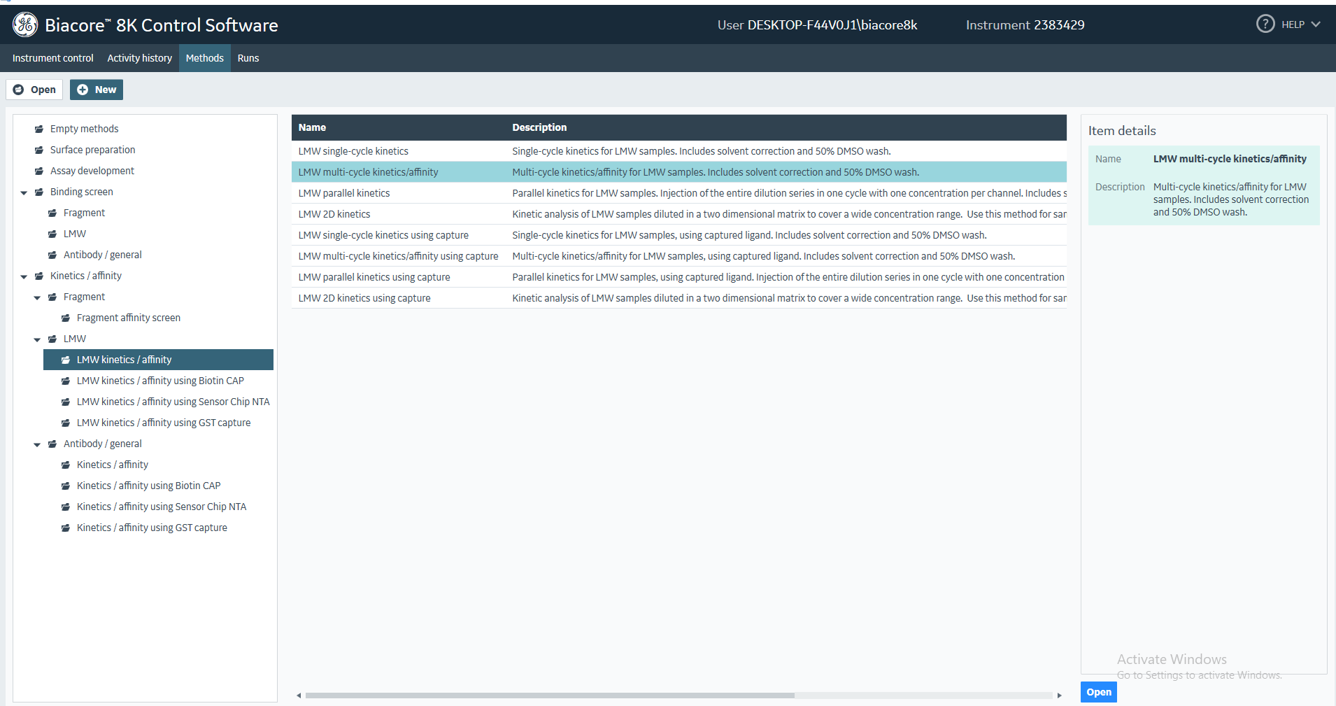 (4)点击Methods,选择New,LMW下拉菜单中的LMW kinetics/affnity,继续选择右栏中的LMW multi-cycle kinetic/affinity,点击Open(图24)。