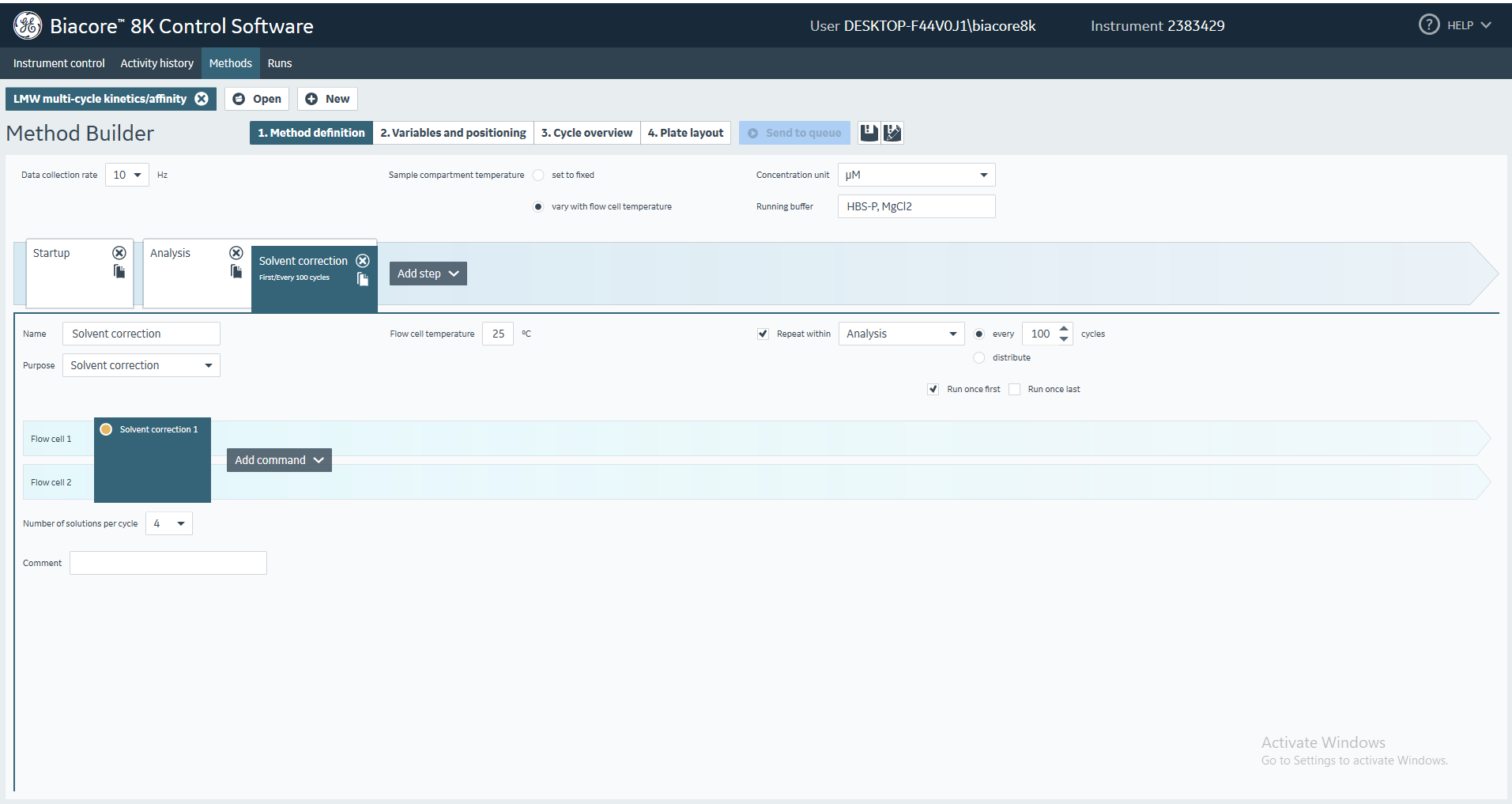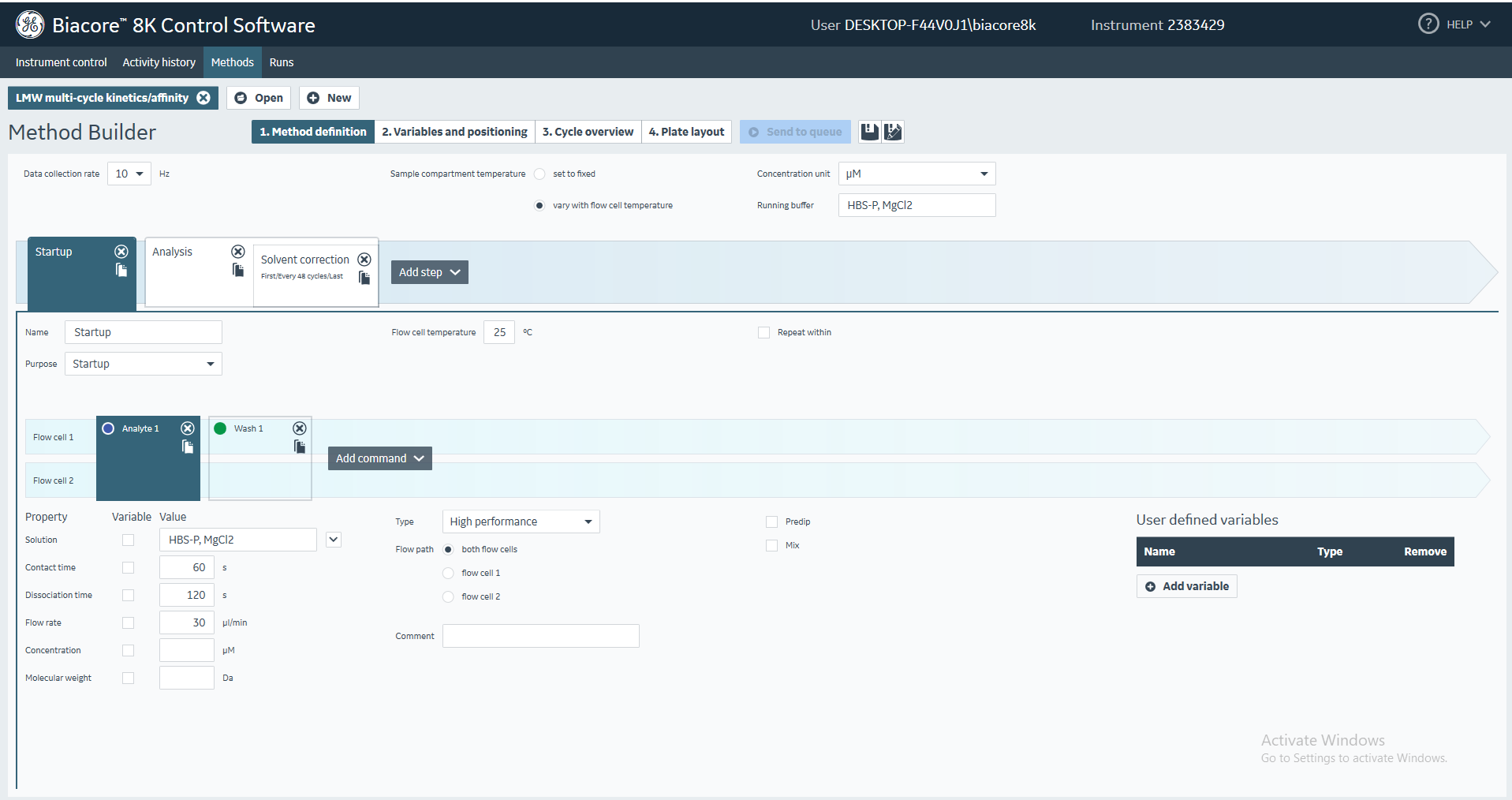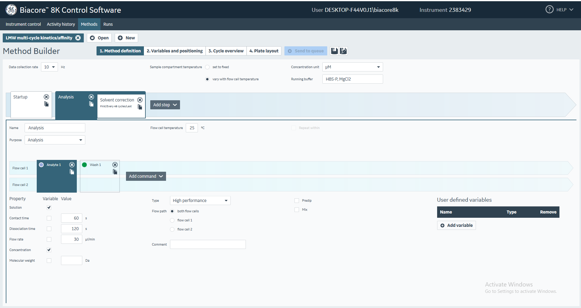 (5)在Method definition界面,点击Start up,选择Analyte 1, Solution输入HBS-P, MgCl2,Contact time输入60 s,Dissociation time输入120 s,Flow rate输入30 µL/min,Type下拉菜单选择High Performance,Flow path选择both flow cells,Wash 1默认50% DMSO溶液,Flow cell temperature默认25 °C(图25)。上述参数的输入都可以按照实验体系的实际情况进行输入和修改。