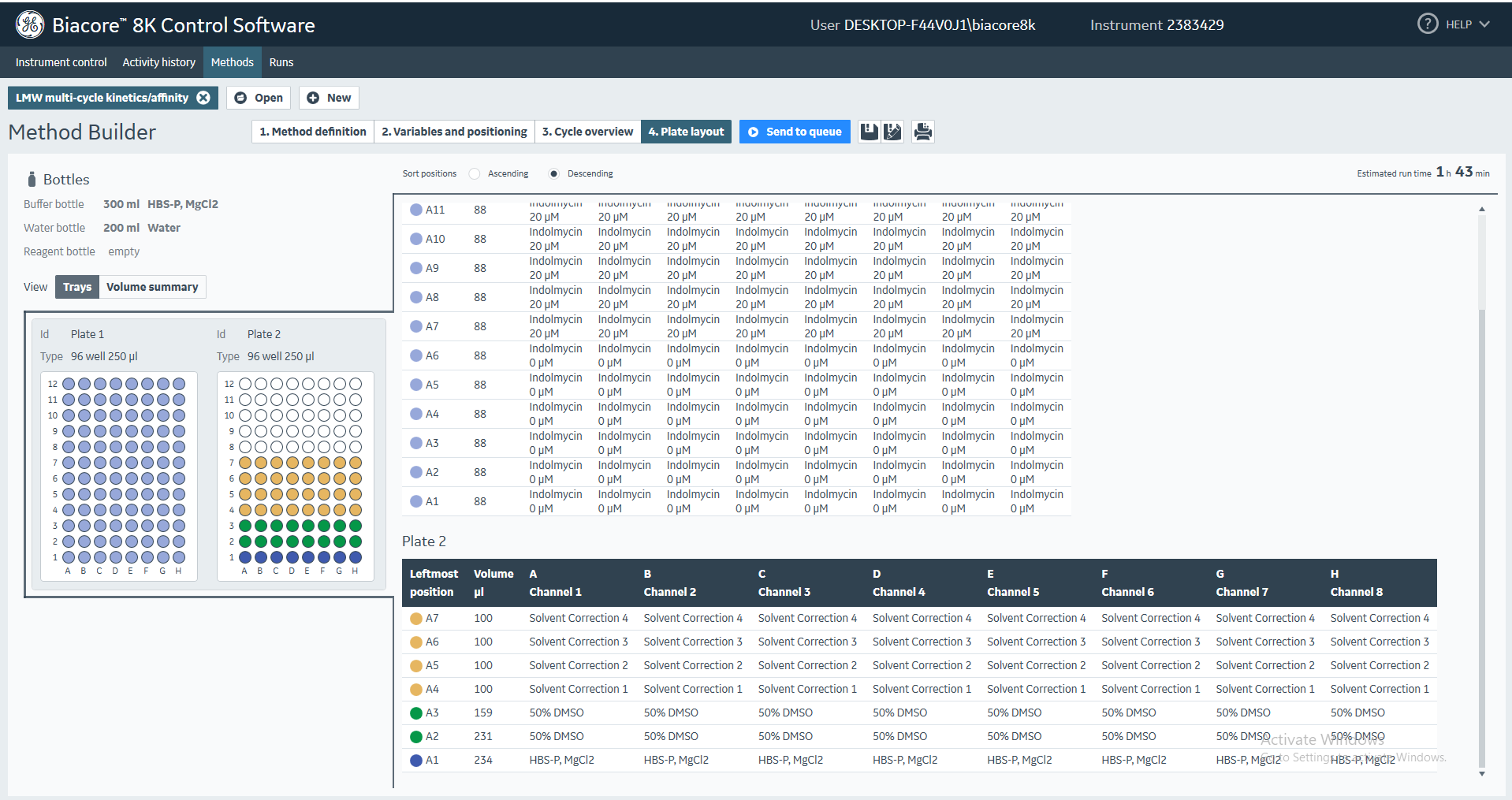 (12)选择instrument control,点击下方的Hotel door is Open,将加好样品的96孔板放置于样品仓的对应位置中,关上舱门。点击Methods,Send to queue,开始正式的互作实验。