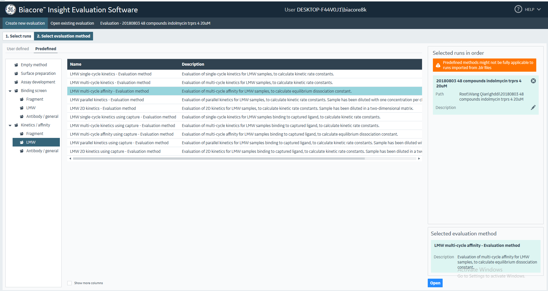 (1)打开数据分析软件Biacore Insight Evaluation Software,在Create new evaluation界面,选择select run,找到运行的程序,点击右下方的select evaluation method。
