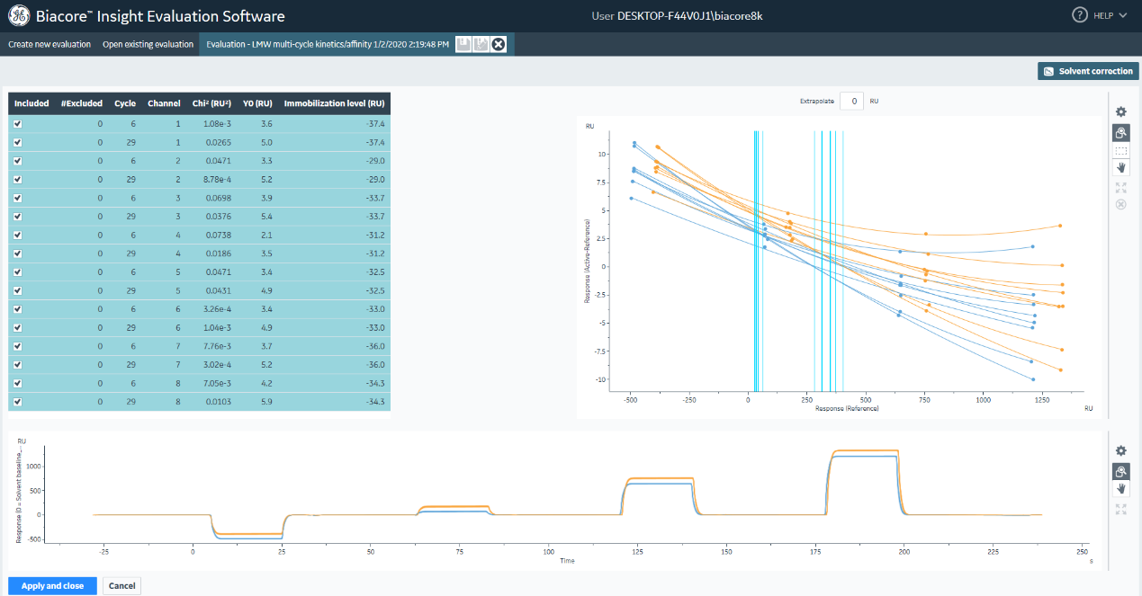 (3)首先弹出Solvent Correction界面进行溶剂校正分析(图33)。若结果正常,点击Apply and close。溶剂校正曲线一般要求落在-500到+1,000 RU之间,Chi2小于2。如果超出此范围较多,一般是由于DMSO浓度配制不准确造成。