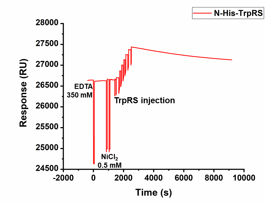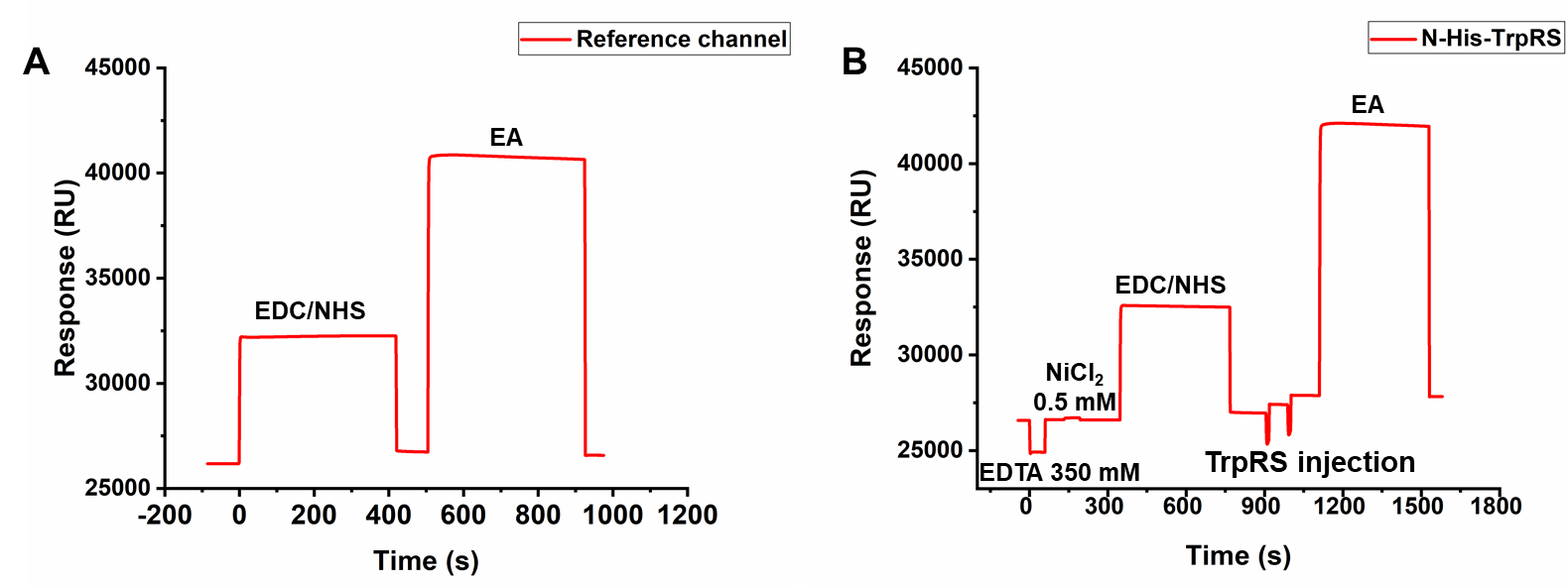 (1)TrpRS的偶联。由于使用的仍为NTA芯片,缓冲溶液仍为PBS-P缓冲溶液,因此可以延续第一部分内容,在此基础上直接进行TrpRS的偶联。