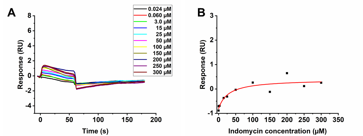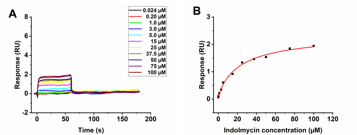 图37. 吲哚霉素在PBS-P实验条件中,对TrpRS的亲和力结果图。A. 吲哚霉素与TrpRS的结合解离传感图;B. 吲哚霉素与TrpRS的亲和力模型拟合结果