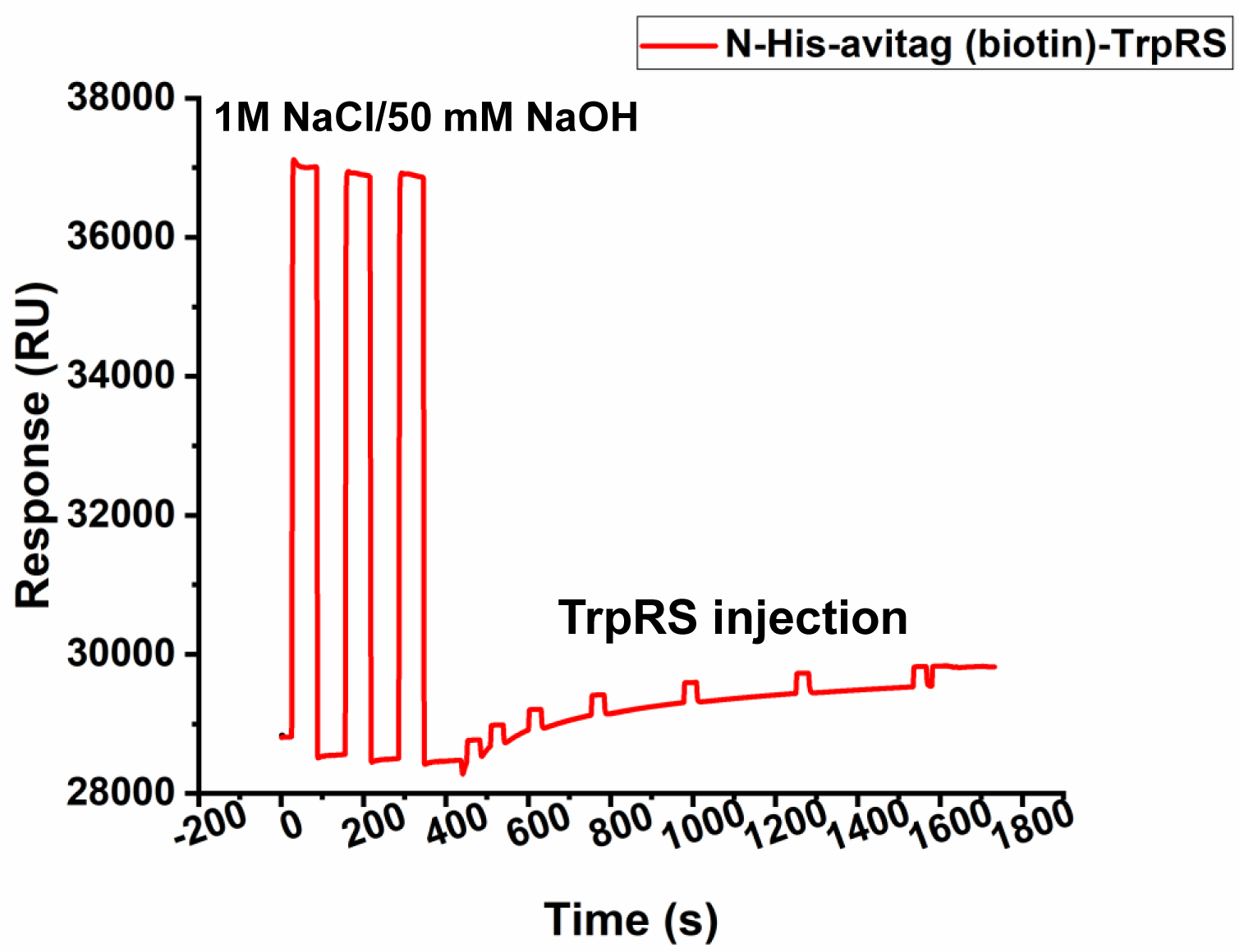 三、SA芯片固定His-avitag (biotin)-TrpRS,表征TrpRS与吲哚霉素的结合
