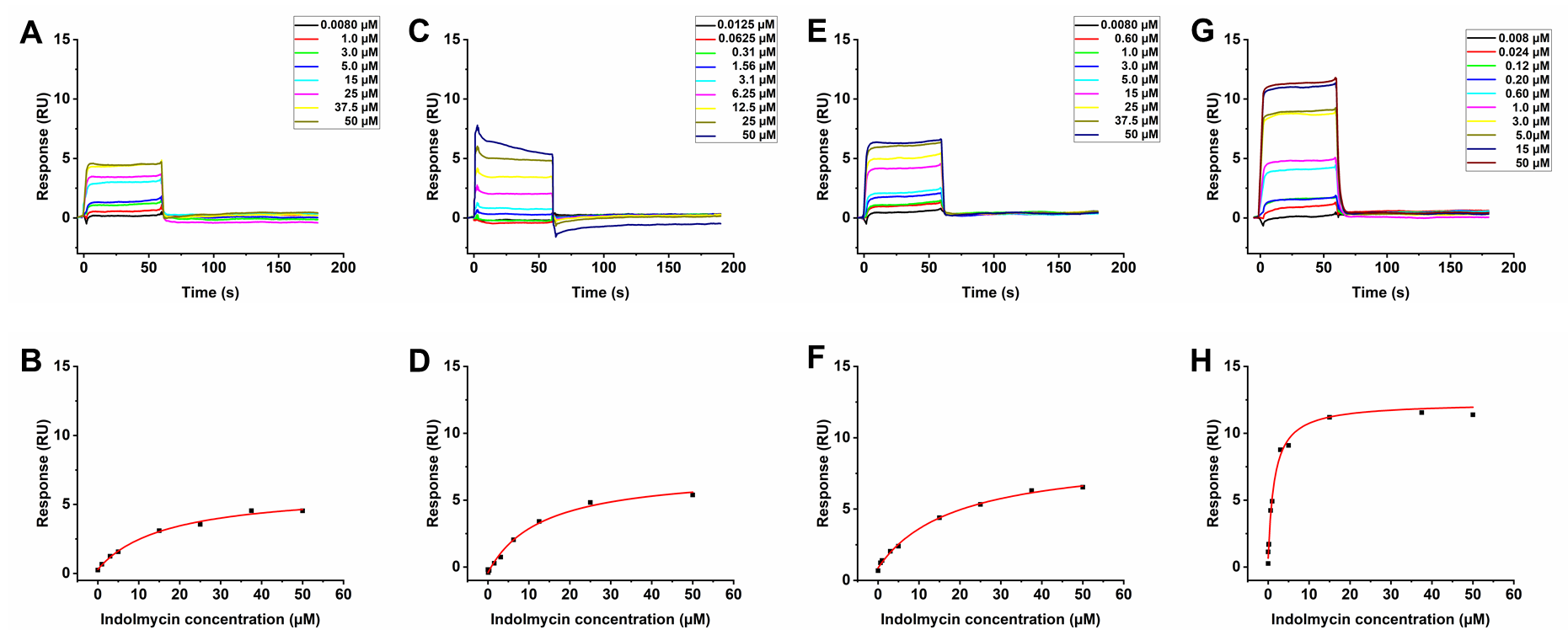 图40 吲哚霉素在PBS-P缓冲溶液(含1.0 mM MgCl2)(A-B),PBS-P缓冲溶液(含1.0 mM ATP)(C-D),PBS-P缓冲溶液(含1.0 mM MgCl2和1.0 mM AMP)(E-F)以及PBS-P缓冲溶液(含1.0 mM MgCl2和1.0 mM ATP)(G-H)实验条件中,对TrpRS的亲和力结果图