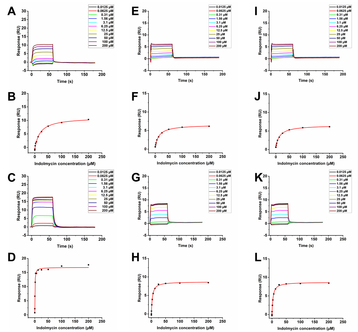 图41. 吲哚霉素在在HBS-P缓冲溶液(含1.0 mM MgCl2)。A⁓B. HBS-P缓冲溶液(含1.0 mM MgCl2和1.0 mM ATP;)C⁓D. PIPES-P缓冲溶液(含1.0 mM MgCl2);E⁓F. PIPES-P缓冲溶液(含1.0 mM MgCl2和1.0 mM ATP);G⁓H. TRIS-P缓冲溶液(含1.0 mM MgCl2);I⁓J. TRIS-P缓冲溶液(含1.0 mM MgCl2和1.0 mM ATP);K⁓L. 实验条件中,对TrpRS的亲和力结果图