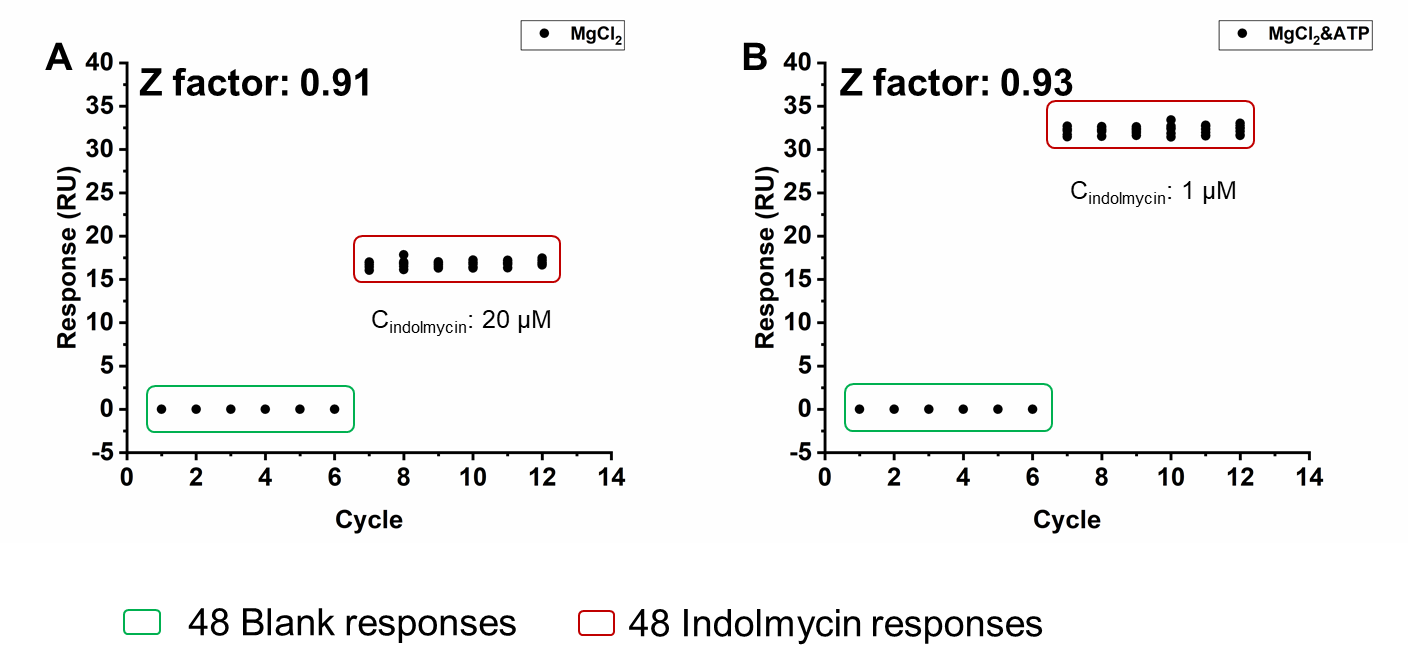 (1)标签和固定方式的优化:本次研究通过多次实验优化了TrpRS的标签和芯片固定方式,使SPR体系在高通量筛选中的适应性和灵敏度显著提高,Z因子数值稳定在0.9以上。这表明多维度优化策略能够提升实验的重现性和数据质量。