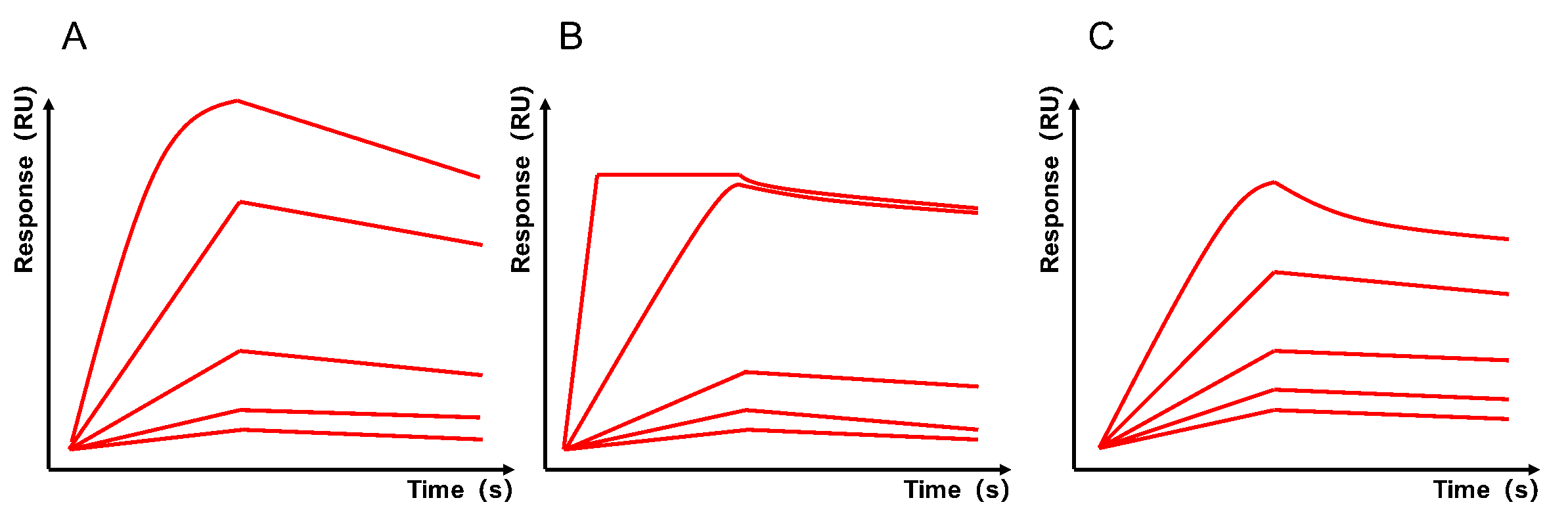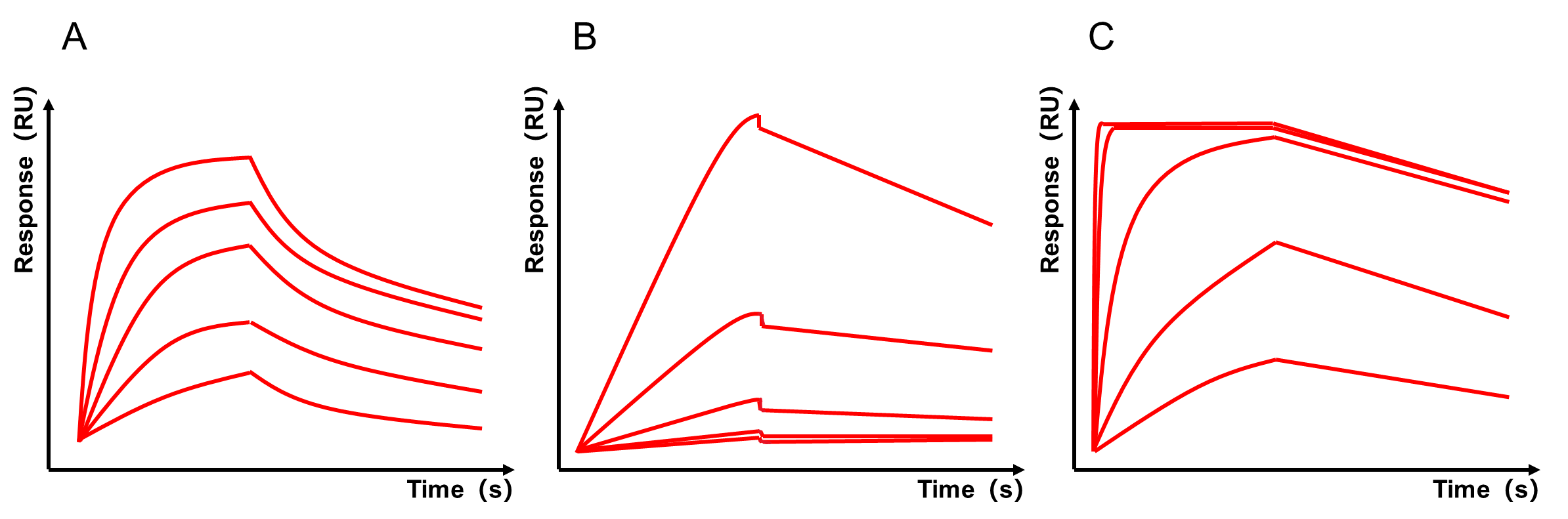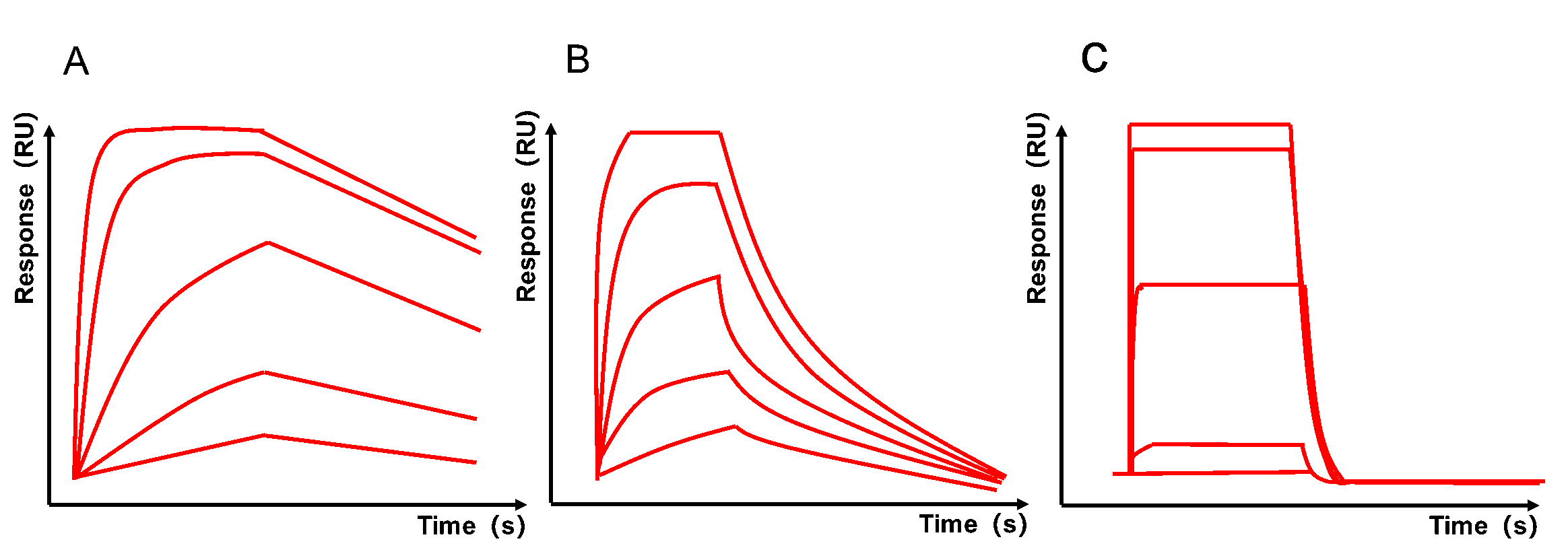 图2 指数曲线。A. 分子间互作亲和力较强,可以观测到传感图上的结合曲率,且分析物较难从配体分子上洗脱; B. 亲和力相对较弱,分析物可以从配体分子上有效洗脱; C. 为非时间依赖性的分子间互作,指数曲线难以观测,但可直观目测到稳态的形成。