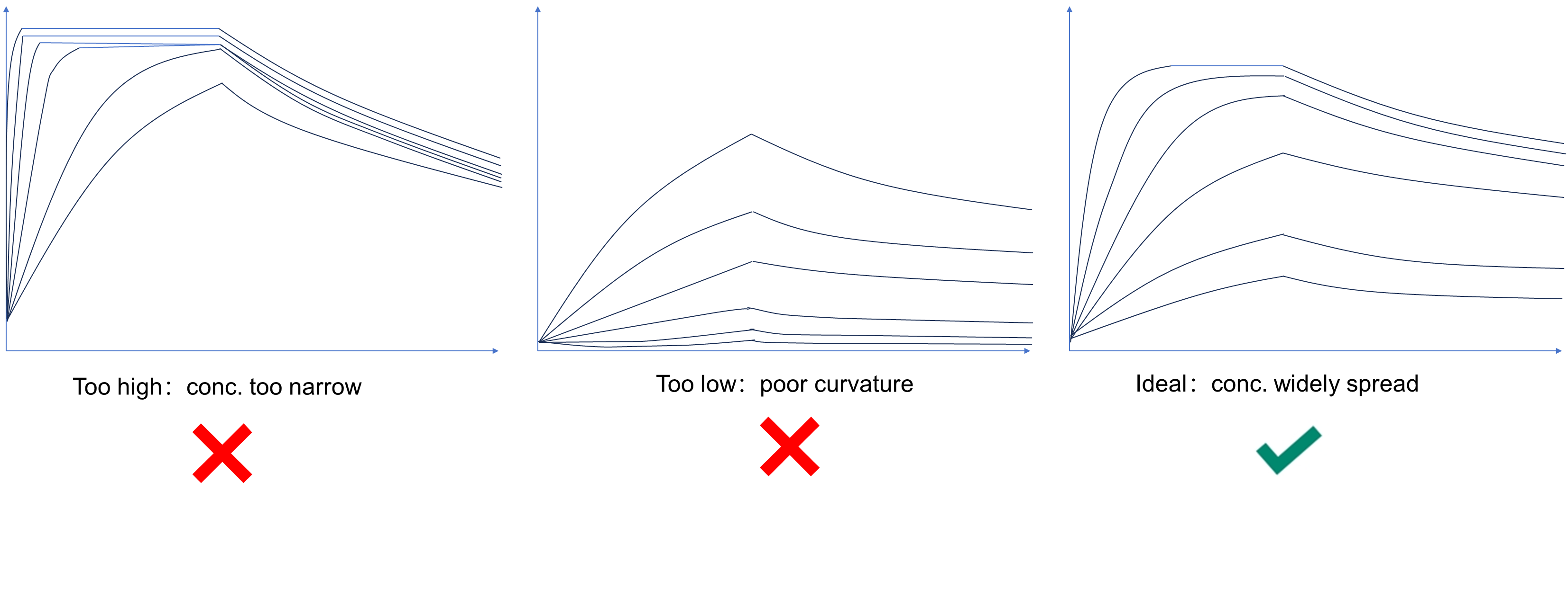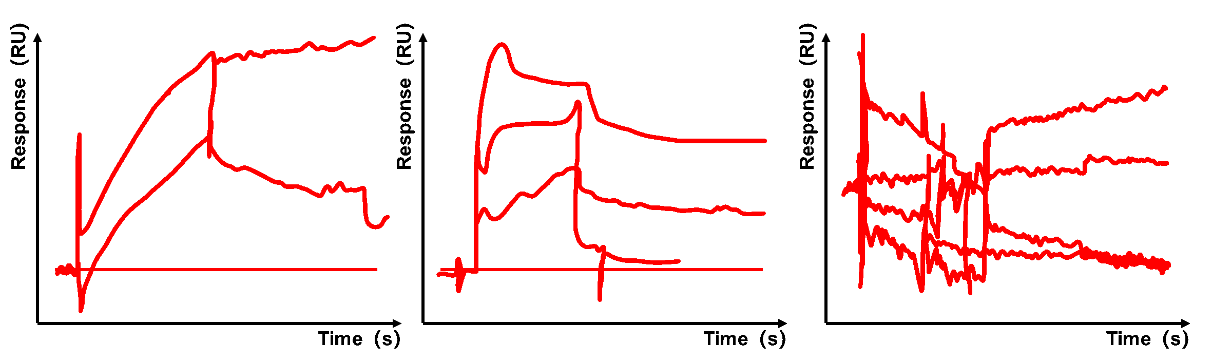 受不同分子间互作的表现形式及亲和力强弱影响,可以展现不同的分子互作形态。 如传感图显示结合阶段相对较快,有明显曲率,解离之前有浓度曲线可以达到平衡;解离相对较快,分析物可以完全从配体上解离干净,基线可以回归;RU值相对较低。尽管结合和解离速率不同,图2是指数曲线的例子[2]。