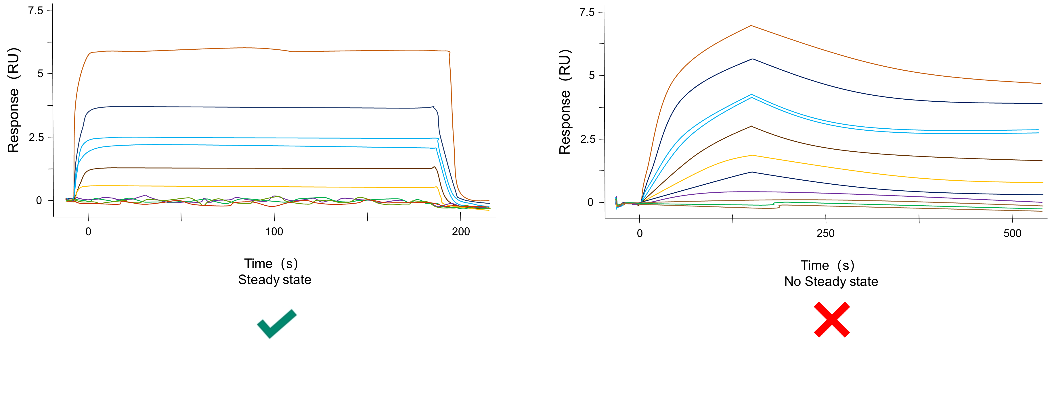 当分析物注射时间足够长,结合到配体的分析物数量与从配体上解离下来的数量是相等的,此时曲线应该逐渐趋于平衡,即达到稳态;所谓的稳态是一个相对的动态平衡状态。