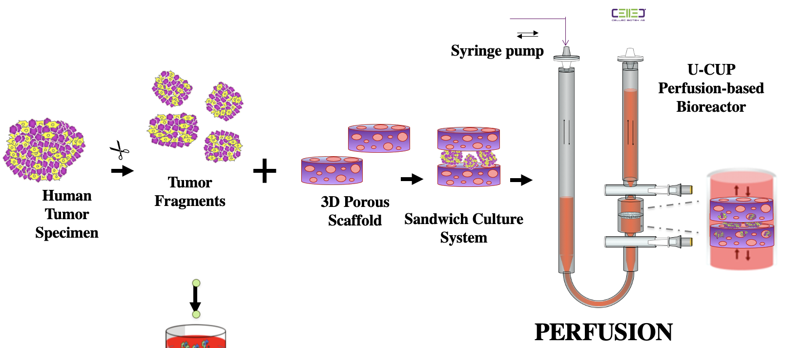 Bioreactor cultures under perfusion were performed according to the manufacturer’s instructions (Cellec Biotek AG, Basel, Switzerland). Briefly, fresh, intact GBM tissue explants were placed into ice-cold Neurobasal-A medium (Life Technologies, #21103049) and immediately taken to the laboratory (less than 30 min). Tissues from the center and periphery of the tumor were cut into ~20- to 30-mm3 fragments.