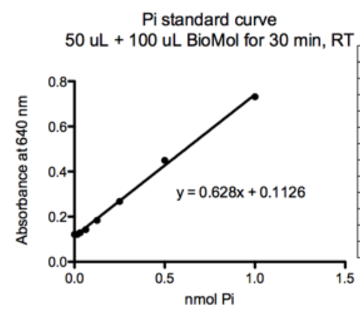 The BIOMOL Green literature states that Phosphate released = (OD640 – Yint)/slope.