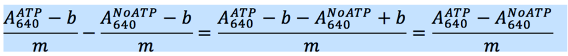 Since the ‘0 ATP’ values (Yint) have already been subtracted from the A640 for each data point in the titration, solving for the PO4 reduces to just dividing the corrected A640 by the slope. Then divide that number by 60 min to get units of nmol PO4/min.