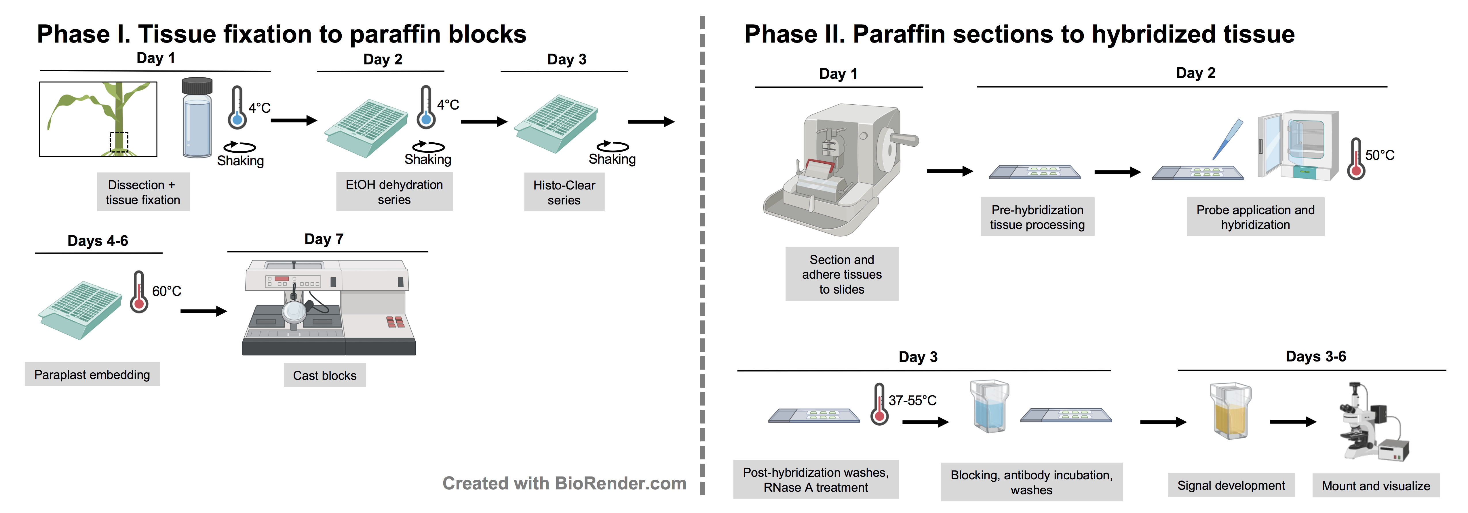 RNA in situ hybridization is a method for visualizing spatiotemporal transcript accumulation in cells and tissues. The method provides clear resolution, is highly sensitive and specific, and can uncover gradients of transcript accumulation within a histologically-intact tissue, which is not possible currently with other methods for transcript detection. RNA in situ hybridization, however, is not a quantitative approach for gene expression. Protocols for RNA in situ hybridization have numerous steps that can span several days of work, complicating troubleshooting procedures. Here, we build on previously published RNA in situ hybridization protocols optimized for paraffin-embedded and sectioned maize tissue (Jackson, 1991; Long et al., 1996 ; Javelle et al., 2011) by providing additional measures for optimized transcript detection.