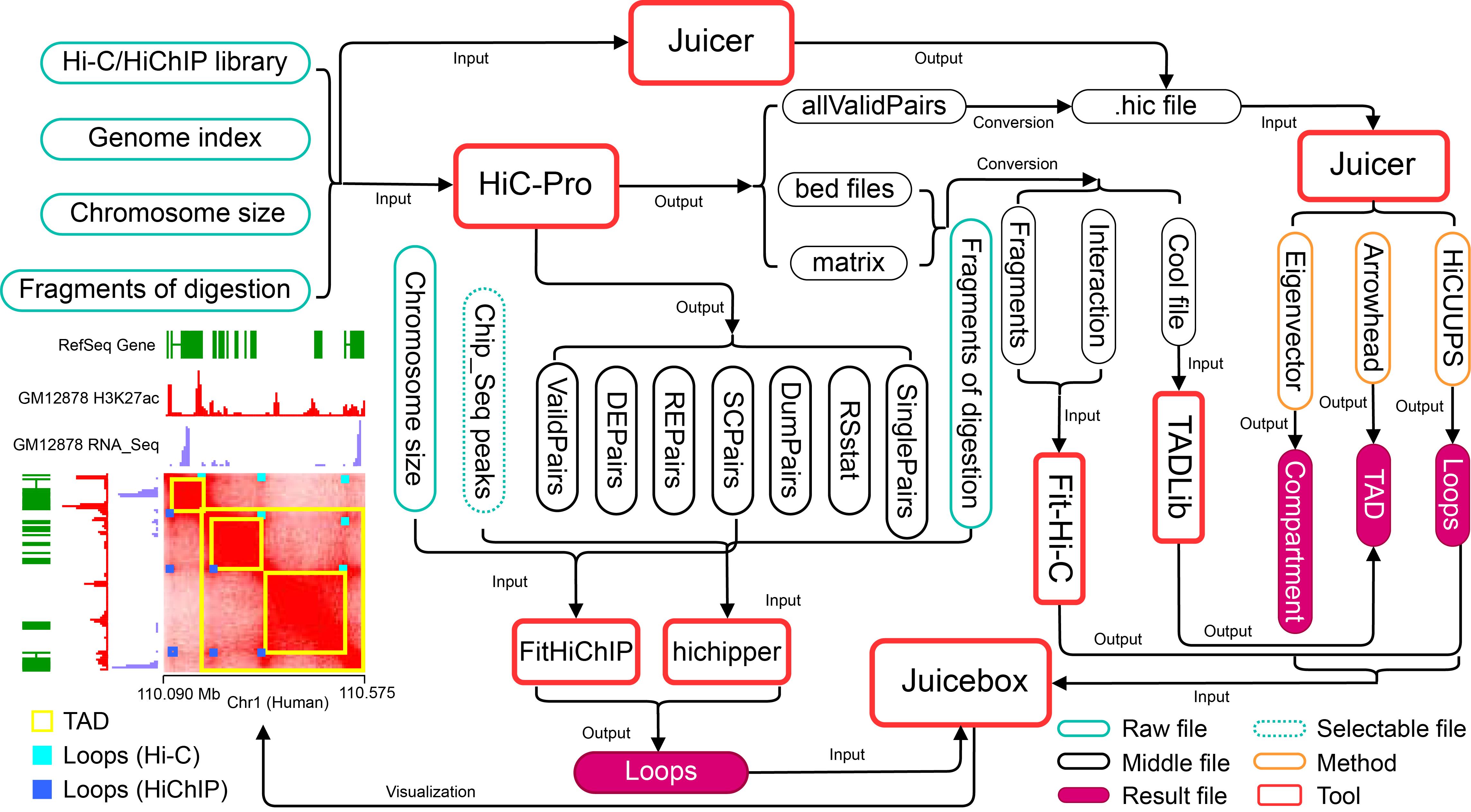 With the innovation in experimental methods of 3D genomic study and the advancement of sequencing technologies, a large number of software tools were developed to identify 3D genome structures (Ay et al., 2014; Wang et al., 2015; Forcato et al., 2017; Bhattacharyya et al., 2019; Yardımcı et al., 2019; Fernandez et al., 2020; Wolff et al., 2020; Mourad, 2022). They have contributed to a boom in the field of 3D genomic research. This also increases the difficulties for researchers to realize them (Forcato et al., 2017). Therefore, a complete order pipeline is very useful for scientific researchers. To achieve this, we summarized the processing of several software tools, including identifying TADs by TADLib and Juicer, inferring loops of Hi-C data by Fit-Hi-C and Juicer, and inferring loops of HiChIP data by FitHiChIP and hichipper. The integration of these software into a whole pipeline by combining HiC-Pro and Juicebox can provide final visualization results from raw reads (Figure 1). The pipeline provides a comprehensive 3D genome analysis process that is applicable not only to Hi-C datasets but also compatible with HiChIP datasets. Moreover, the pipeline eliminates the need for complex intermediate steps in multiple software, providing users a simple and efficient experience while preserving the software's customizable function. In summary, the pipeline provides user-friendly features that are especially beneficial for researchers who are new to 3D genome analysis.