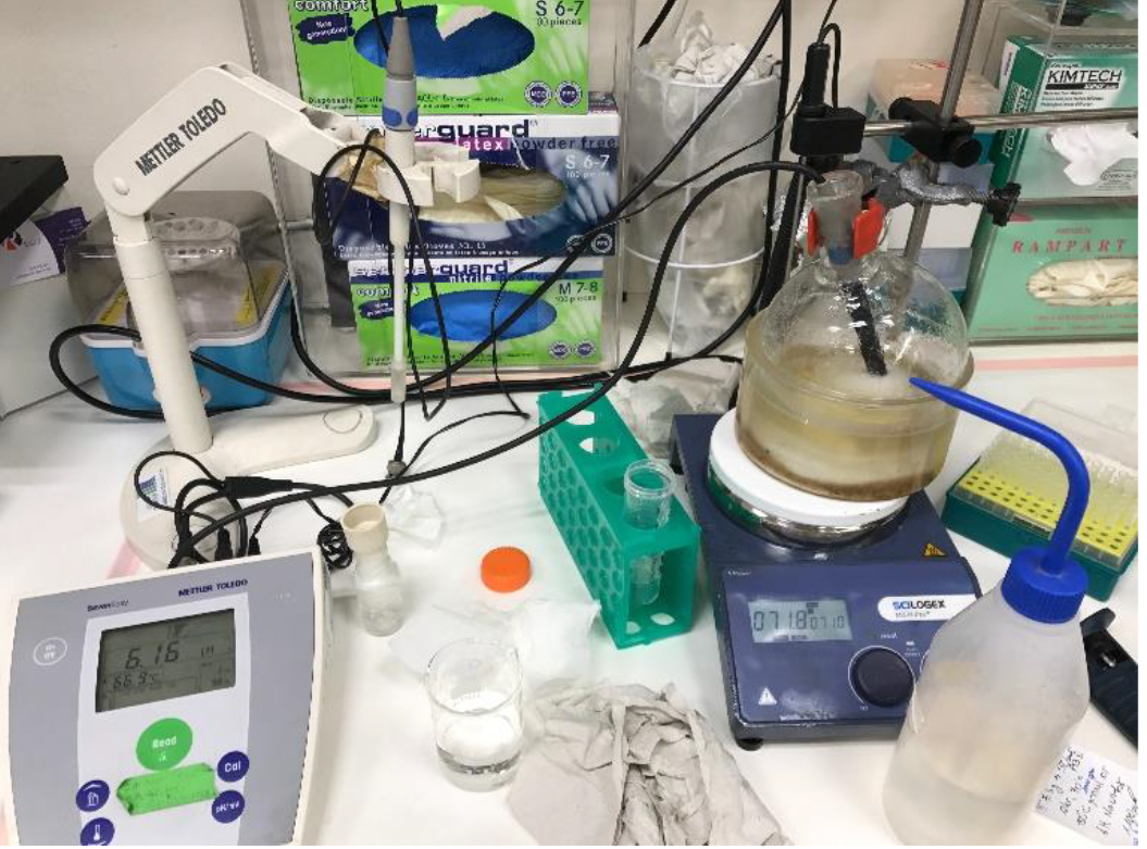 Figure 1. Gelatin pH calibration. *Image was taken during the formation of an Un-sterile batch. In order to create a sterile batch, pH calibration is done inside a biological hood as described above.